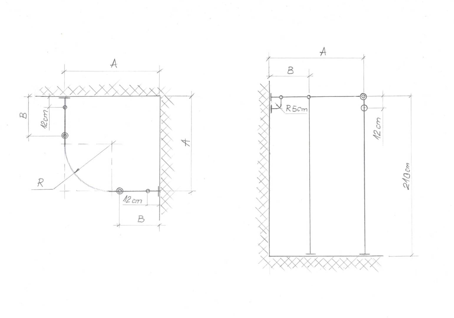 This is a dressing room model for installation in the corner between two walls. The design is practical and provides maximum space when closing the corner with a curtain.