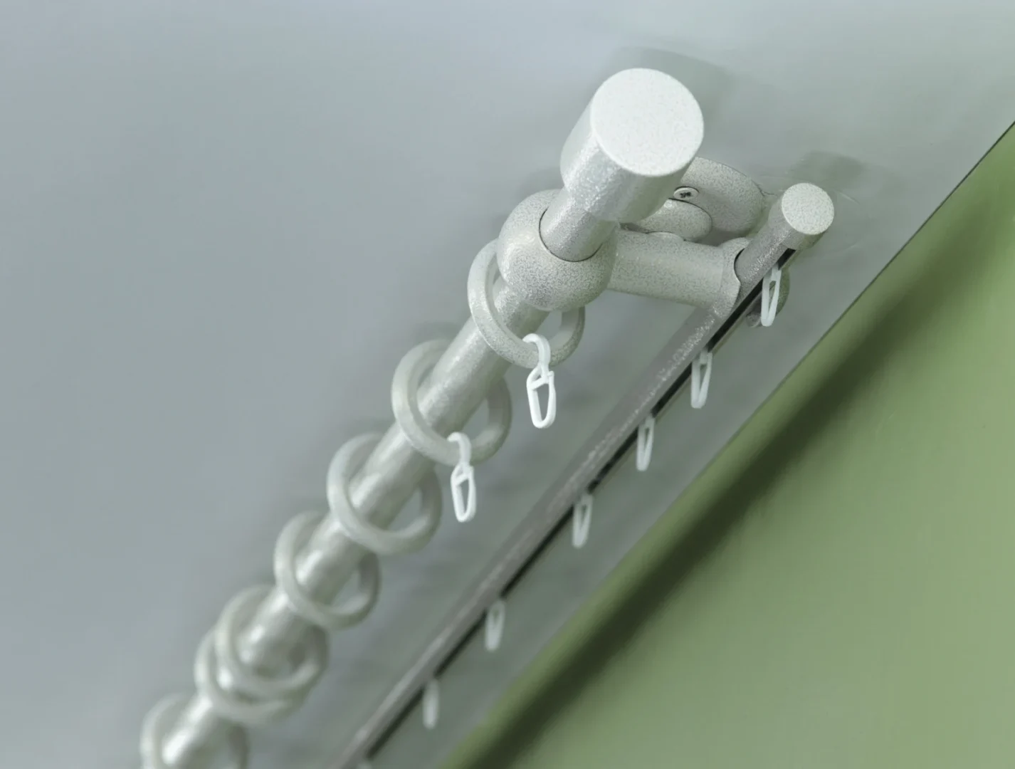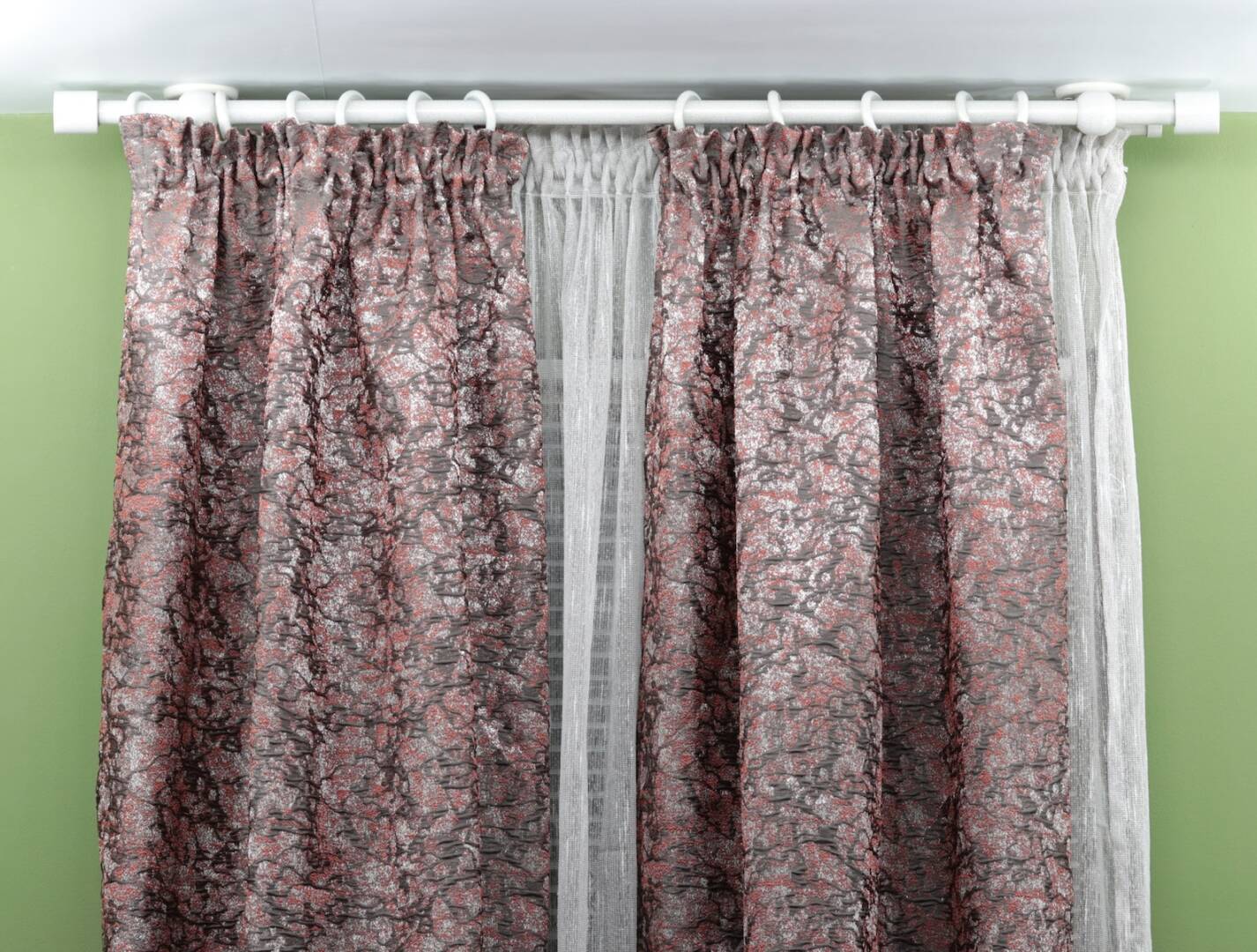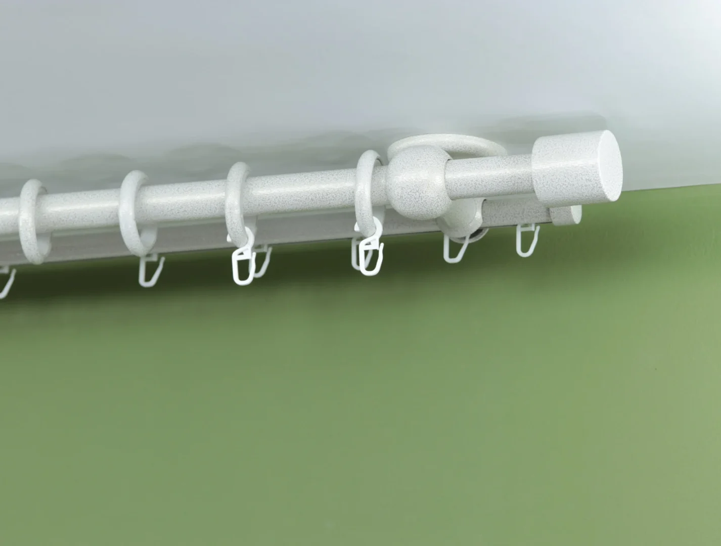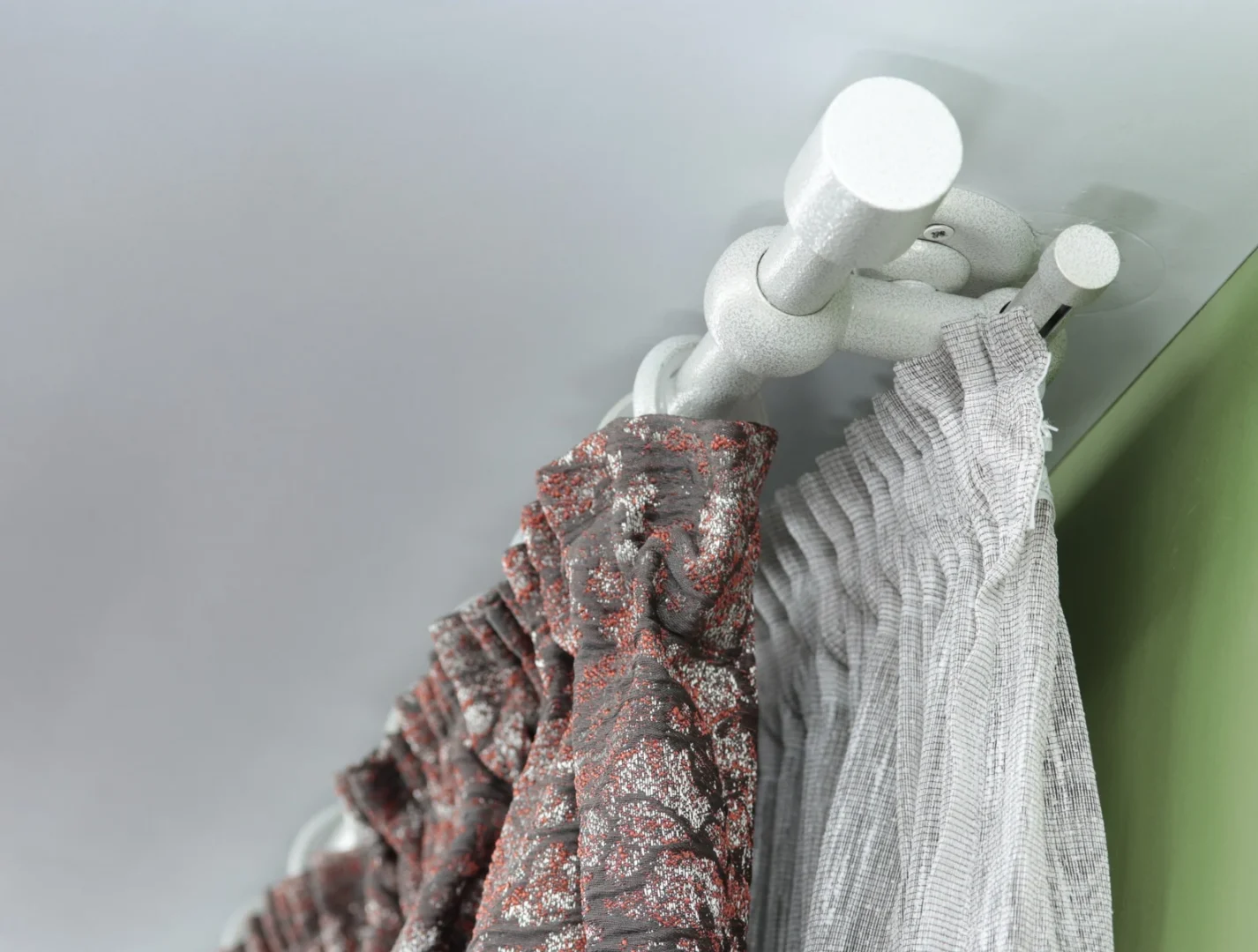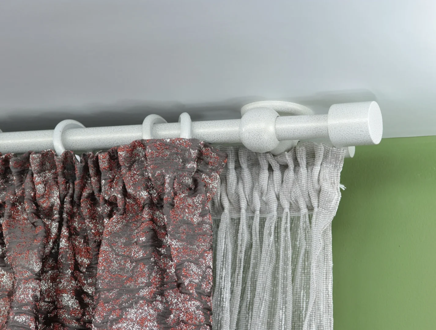 Double curtain rod & rail with short ceiling brackets is combination with two different poles (rod- ø22mm and rail ø16mm in diameter) for windows and doors with steel rings and hooks + plastic rollers. This is a unique combination between a classic style curtain rod with metal rings (front) and a modern rail with hidden plastic sliders (back).