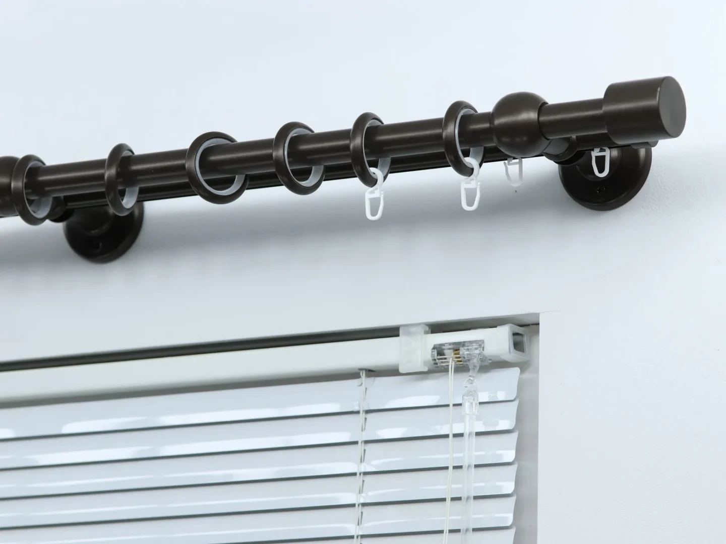 Double curtain rod & rail is combination with two different poles(rod- ø22mm and rail ø16mm in diameter) for windows and doors with steel rings and hooks + plastic rollers. This is a unique combination between a classic style curtain rod with metal rings (front) and a modern rail with hidden plastic sliders (back).