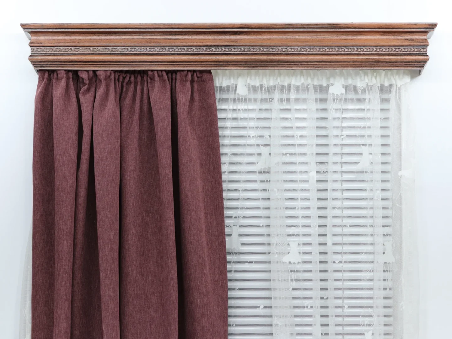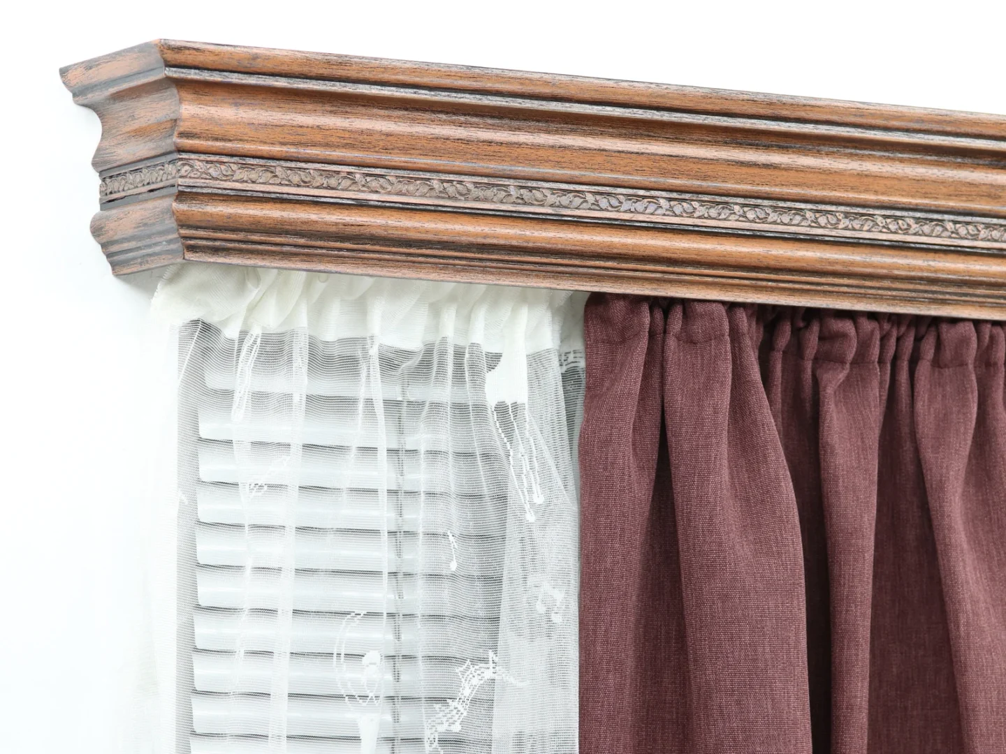 Solid wooden rail with built-in aluminum profile for smooth movement of the sliders and easy movement of the curtain. For every dimensions see the drawing.