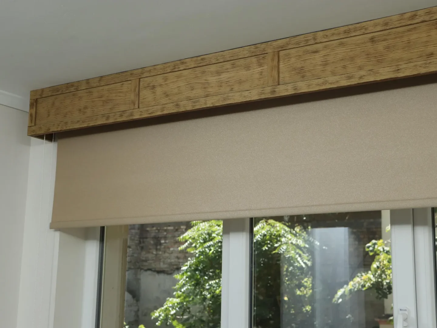 This window valance is with a clean design made of Veneered MDF with Natural Veneer OAK (high quality material), real burnt wood method of craftsmanship and finish with varnish.