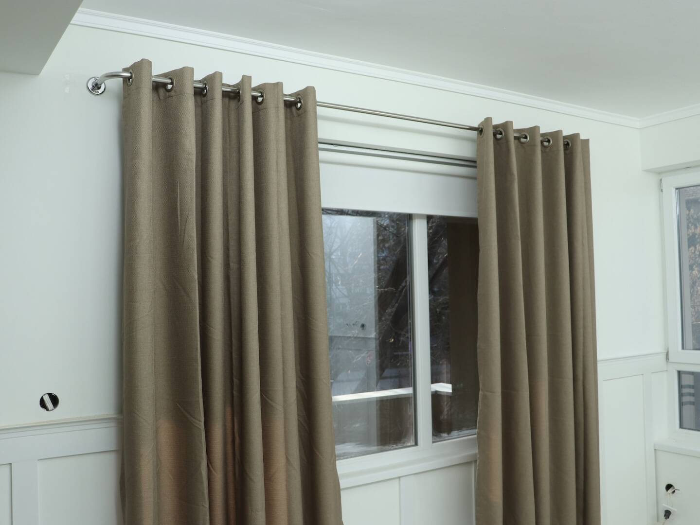 It also prevents sunlight from entering both sides of the curtain rod because the curtains can lean against the wall as seen in the photos.