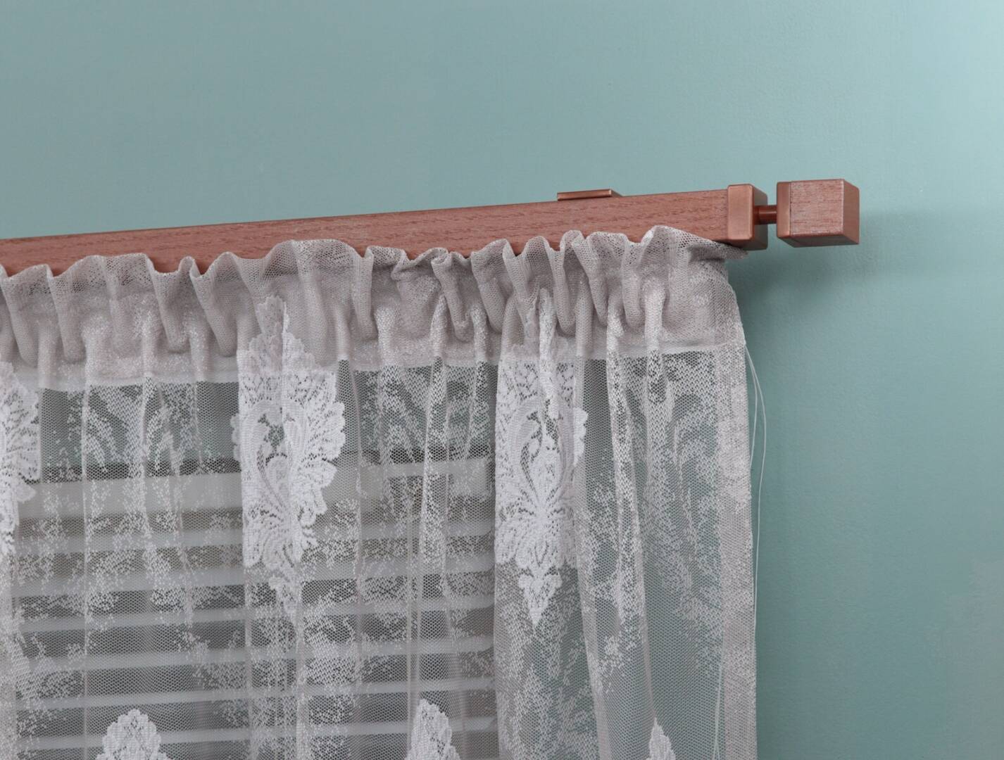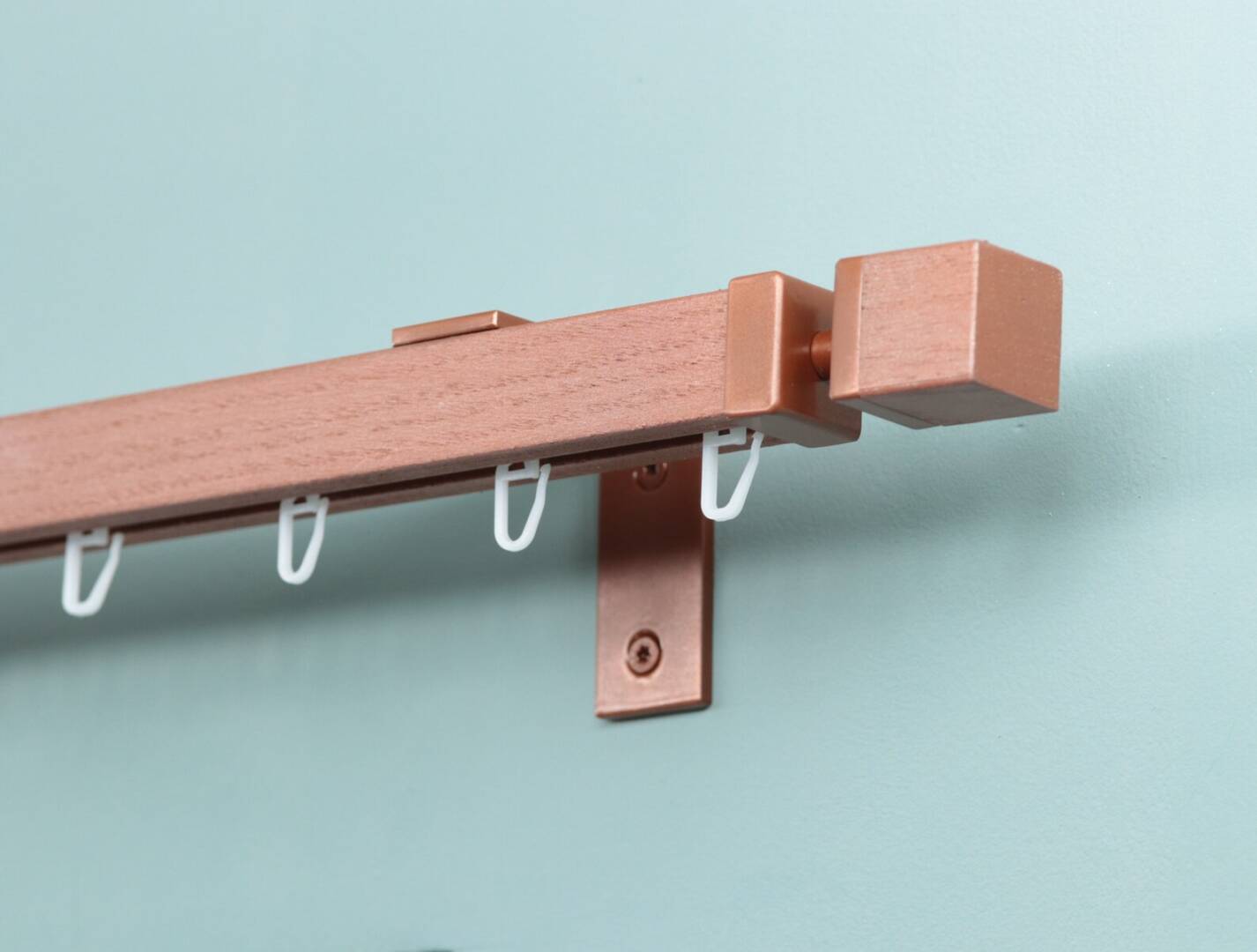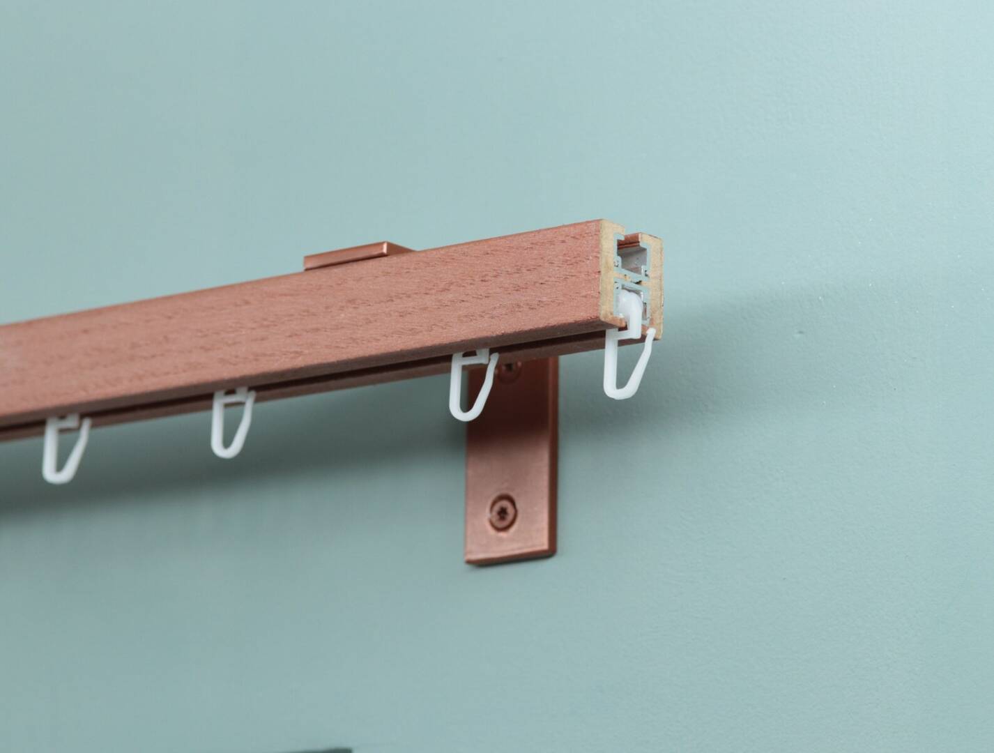 Single wooden window rail (Veneered MDF OAK Profile and Aluminum Rail) with plastic hook-rollers, wall brackets and Cube ends.