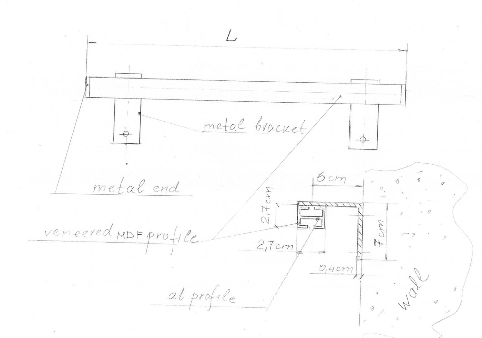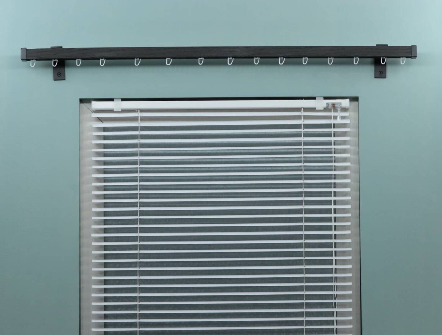 Single wooden window rail (Veneered MDF OAK Profile and Aluminum Rail) with plastic hook- rollers, wall brackets and plug ends.